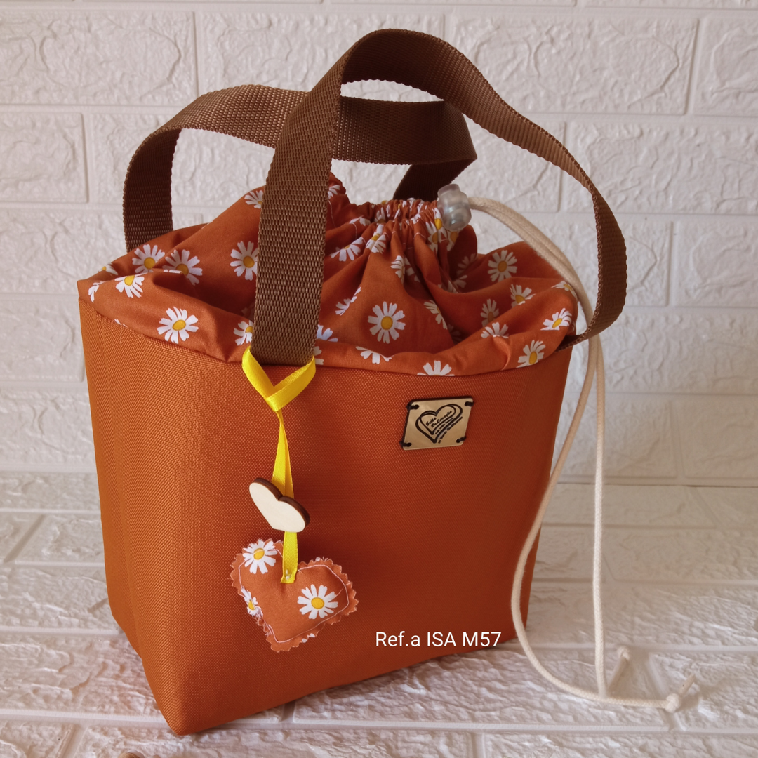 Dimensões +/- 21*23*13 cm. O tecido exterior escolhido foi o mostarda, mas pode optar por escolher outra cor e conjugar com um padão da sua preferência, contacte a artesã.