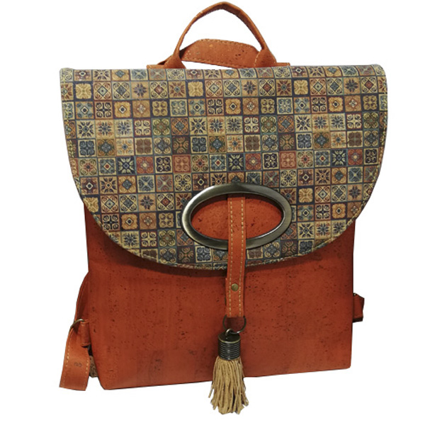 Mochila em cortiça com padrão geométrico colorido na tampa e tassel de cortiça