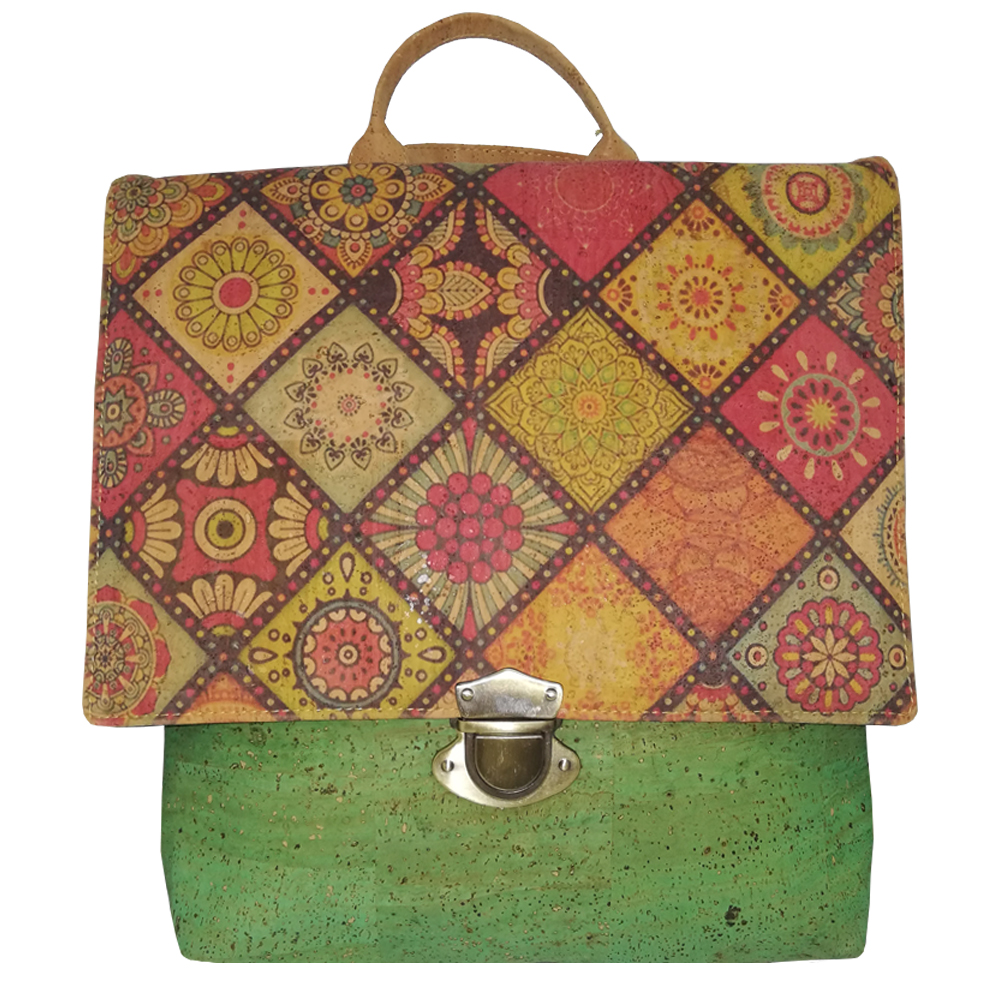 Mochila Hera para notebook com pala impressa. Alça em cortiça ajustável e adaptável a saco tiracolo. Bolso interior e zip exterior nas costas e frente por baixo da pala. Impermeável e fácil limpeza