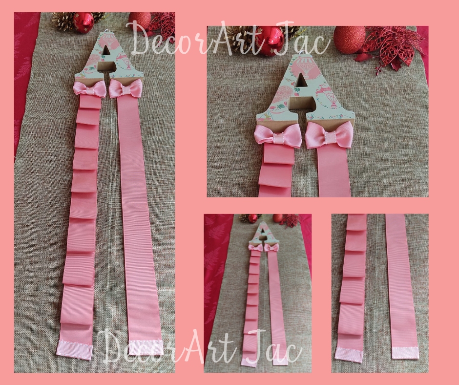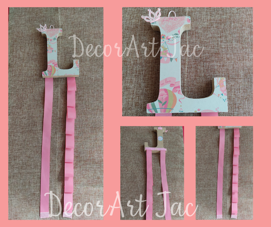Suporte organizador de Lacos e Bandoletes personalizados com a inicial do nome da criança, letra em madeira decorada em papel, suporte em fita gorgurão.enfete para parede.Informação adicional