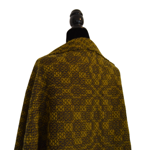 Cachecol feito em teia de algodão e trama de lã, leve, suave e quente, com padrão original, desenhado por mim. Cada lado